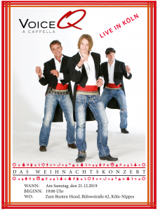 hnachtskonzert von VoiceQ in diesem Jahr findet am 21.12.19 statt und beginnt um 19:00 Uhr.