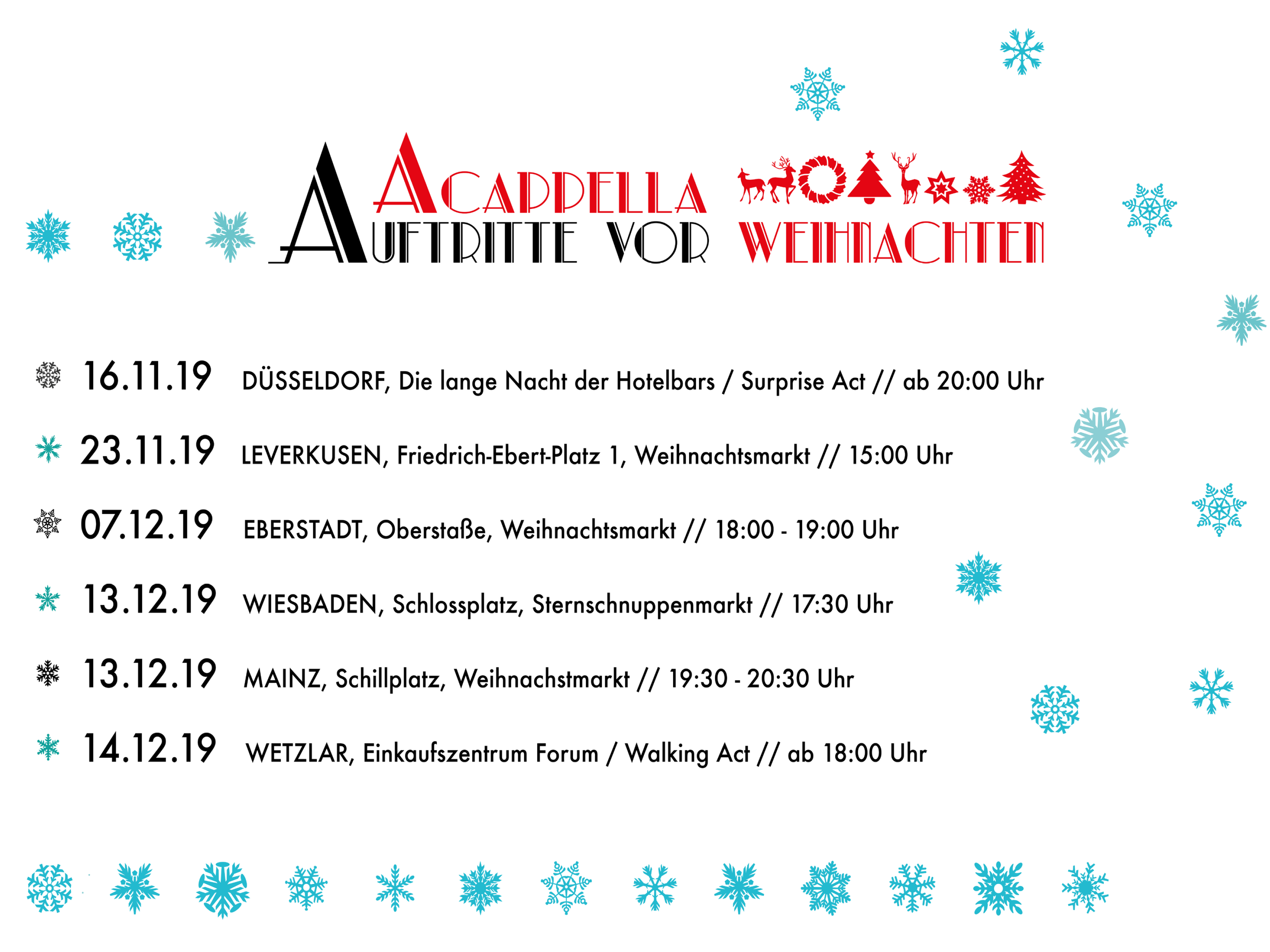 Vor und um die Adventszeit sind wir wieder bei einigen Terminen öffentlich zu hören und zu sehen. Alle Besucherinnen und Besucher erwartet ein erfrischender, musikalischer Weihnachtszauber mit dreistimmigem Acappella Gesang. Wir verleihen dem Advent ganz zeitgemäß, eine besinnliche, festliche und unterhaltend fröhliche Stimmung und heizen euch mit unserem überraschendem, musikalischem „Crossover“ ein.